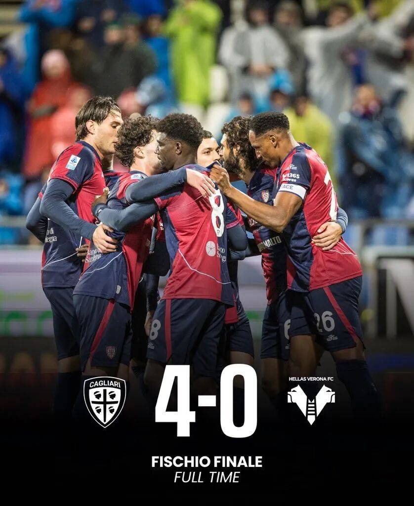 卡利亚里上轮意甲主场4-0大胜维罗纳取得三连胜,这是他们重返意甲后首次做到这一点。卡利亚里沿用了击败佛罗伦萨的首发阵容,他们的三连胜始于主场击败尤文图斯。面对积分榜垫底的维罗纳,卡利亚里没有丝毫手下留情。上半场Luca Mazzitelli抽射破门,前锋Semih Kilicsoy禁区内侧身扫射破门,20岁的土耳其小将打入了本赛季第四个意甲进球。下半场维罗纳前锋萨尔防守时动作过大领到第二张黄牌被罚出场,占据人数优势的卡利亚里乘胜追击,又一位从亚特兰大租借的球员Ibrahim Sulemana取得进球,Riyad Idrissi头球破门最终结束了这场一边倒的比赛。